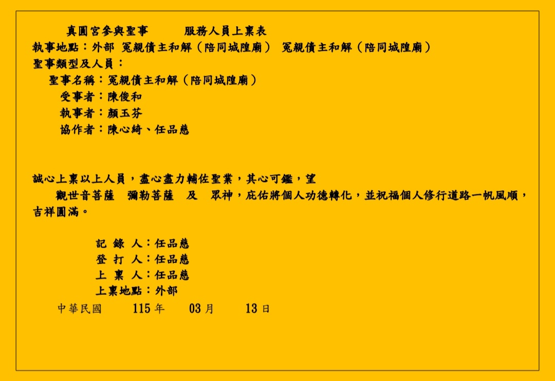 真圓宮參與聖事 服務人員上稟表
