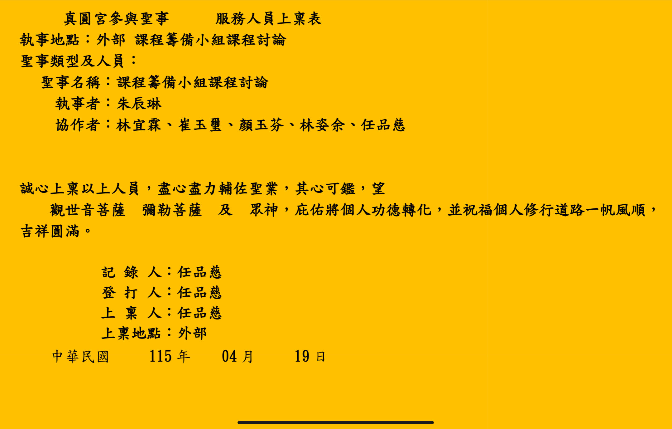 真圓宮參與聖事 服務人員上稟表