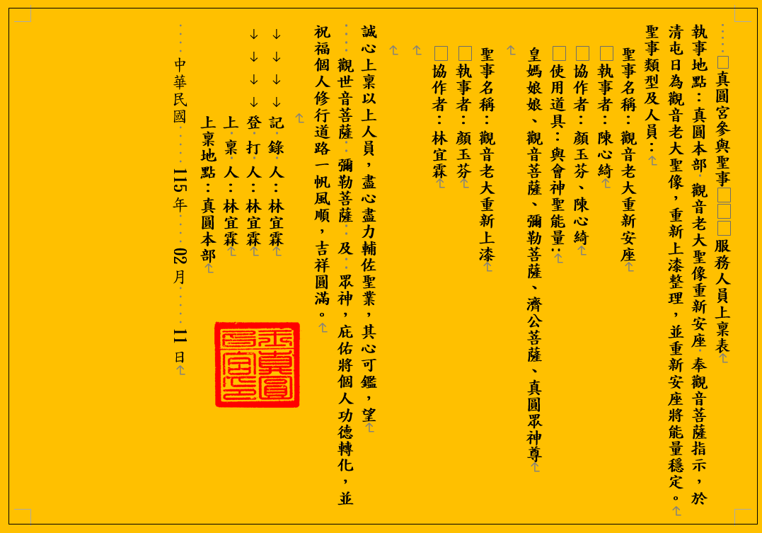 真圓宮參與聖事   服務人員上稟表