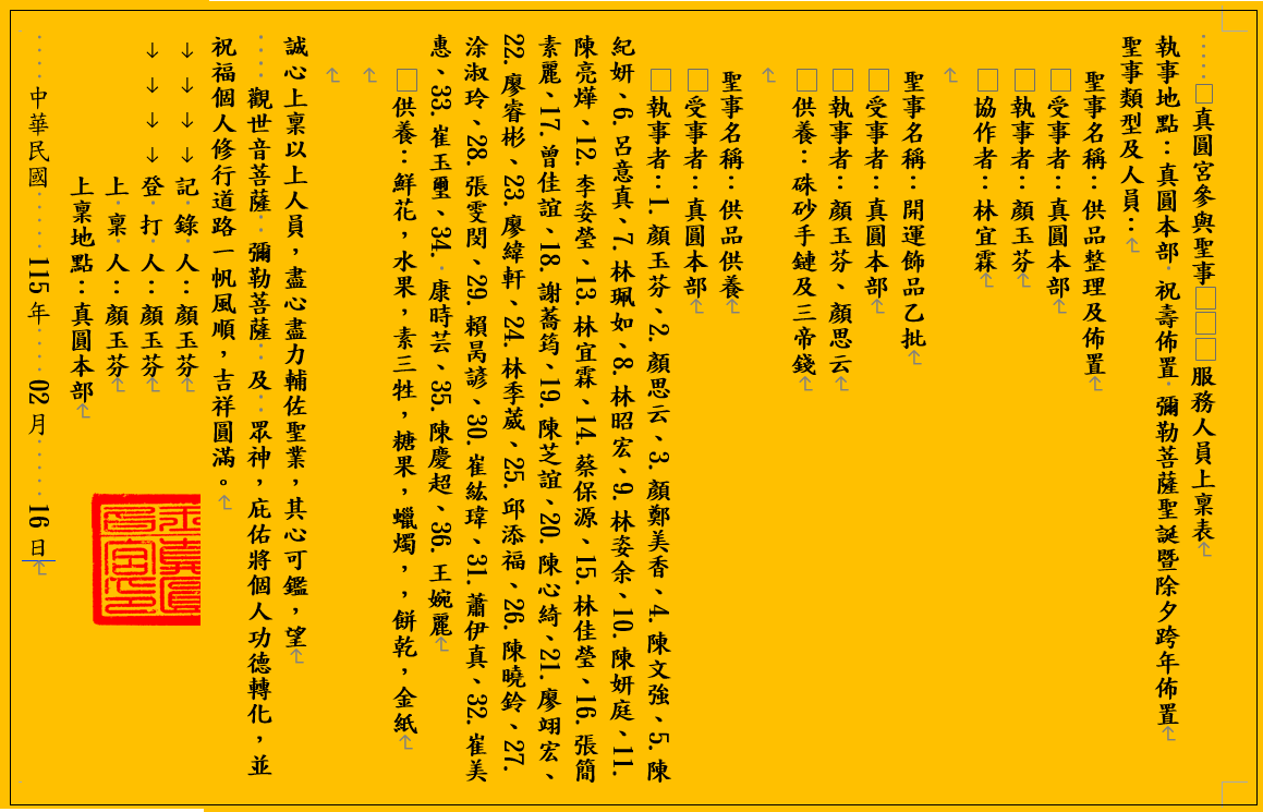 真圓宮參與聖事 服務人員上稟表