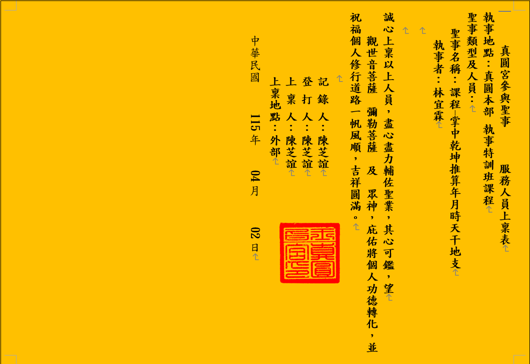 真圓宮參與聖事 服務人員上稟表