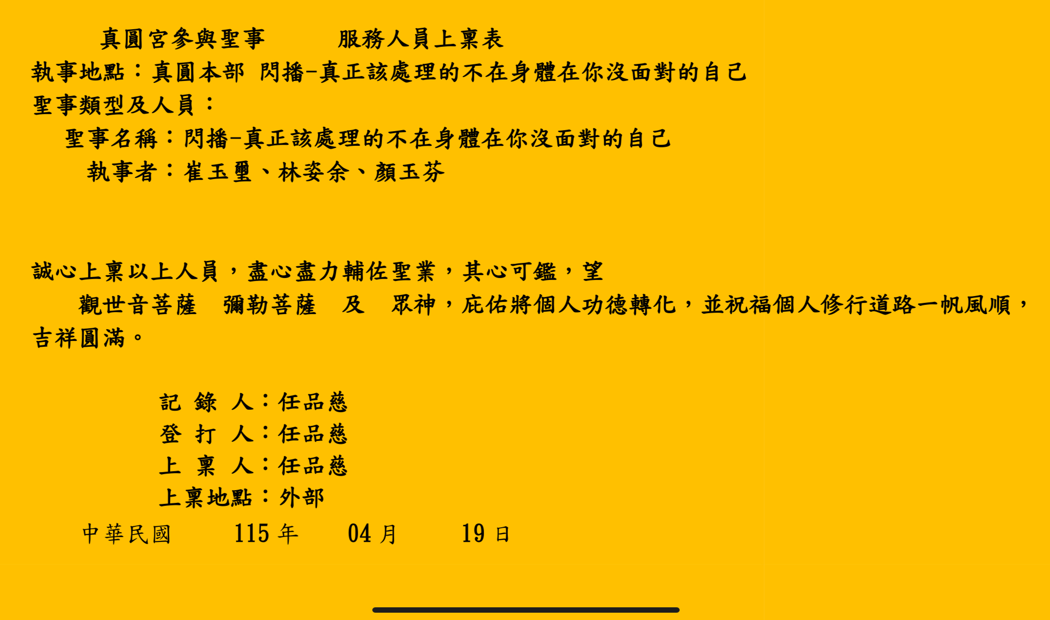 真圓宮參與聖事 服務人員上稟表